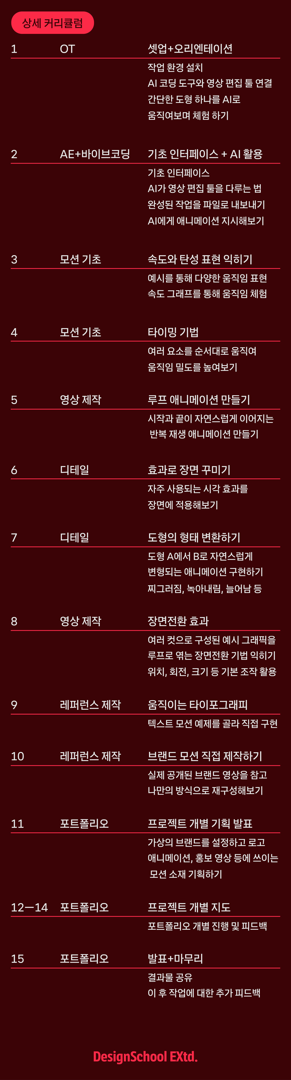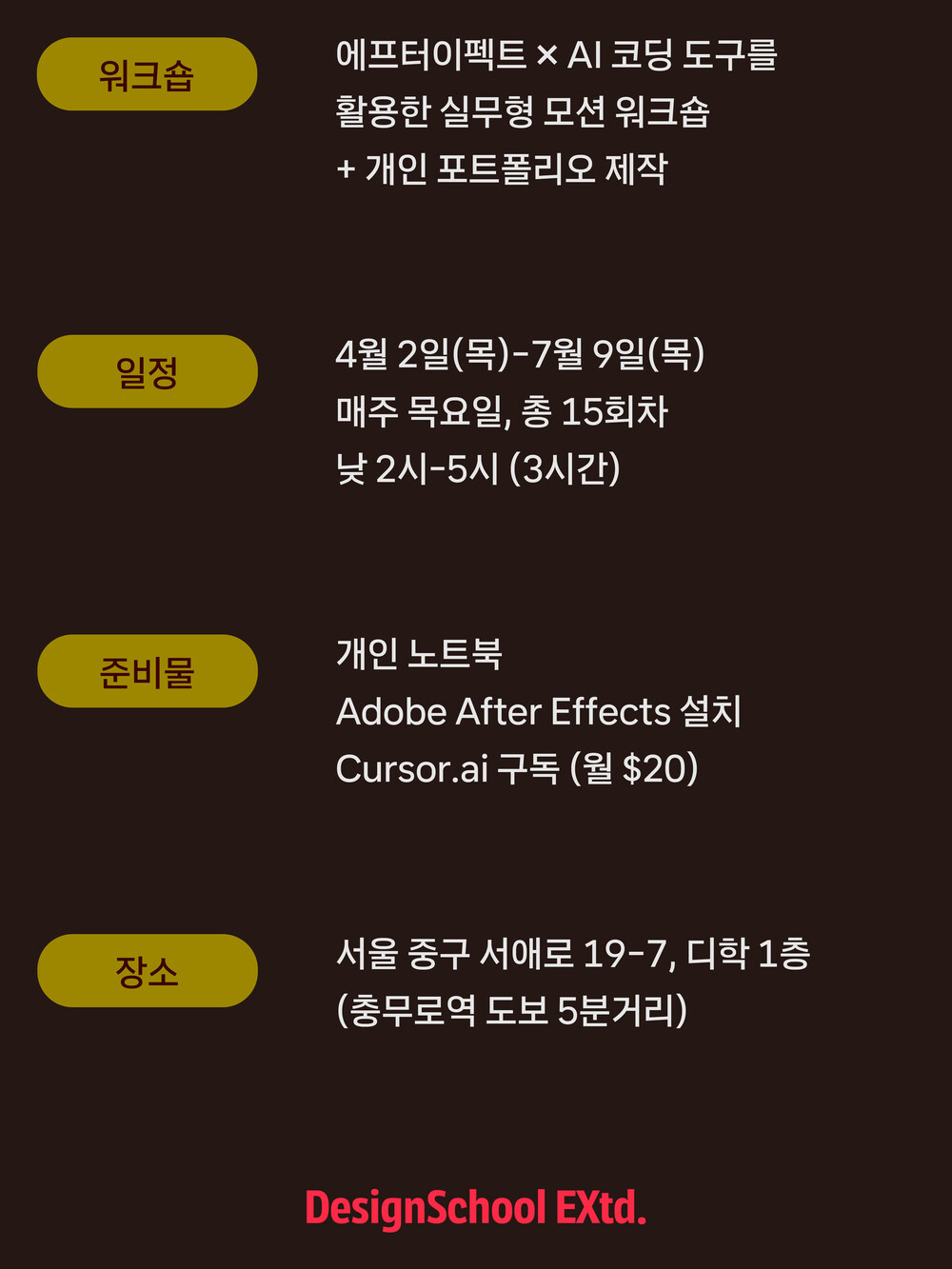 모션그래픽을 제대로 배우고 싶은 전공자 그리고 AI 시대에도 디자인 감각을 가지고 작업하고 싶은 사람에게 추천합니다.
